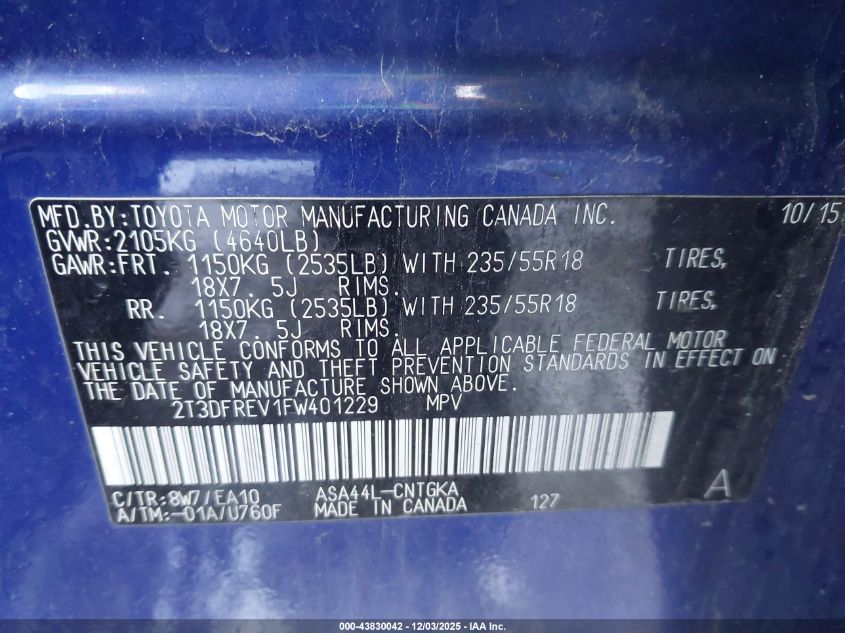 2015 TOYOTA RAV4 2015 року Бензин, 2.5, Полный привод, vin - 2T3DFREV1FW401229 из США