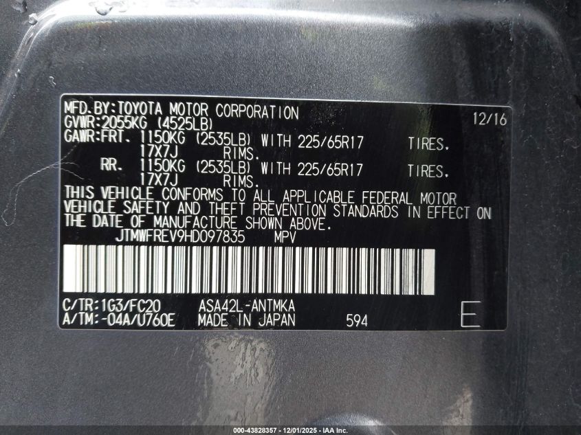2017 TOYOTA RAV4 2017 року Бензин, 2.5, Передний привод, vin - JTMWFREV9HD097835 из США