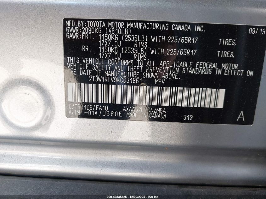 2019 TOYOTA RAV4 2019 року Бензин, 2.5, Передний привод, vin - 2T3W1RFV9KC031861 из США