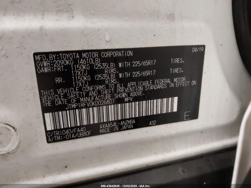 2019 TOYOTA RAV4 2019 року Бензин, 2.5, Полный привод, vin - JTMP1RFV0KD026807 из США