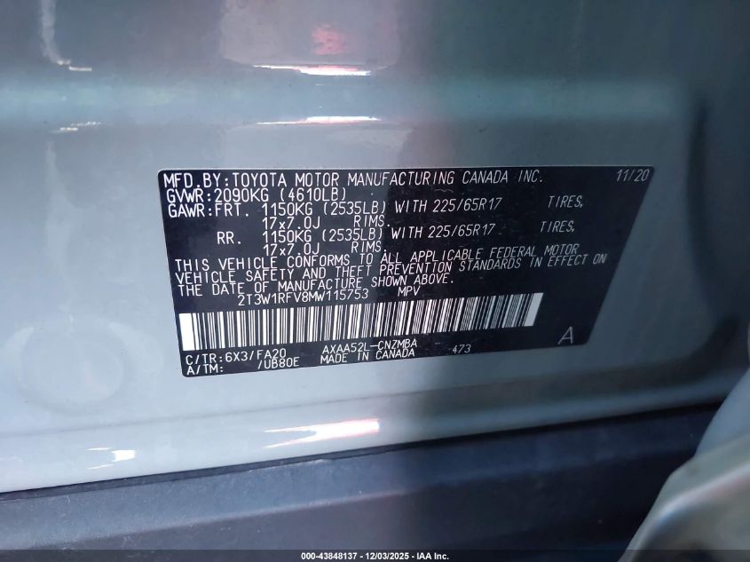 2021 TOYOTA RAV4 2021 року Бензин, 2.5, Передний привод, vin - 2T3W1RFV8MW115753 из США