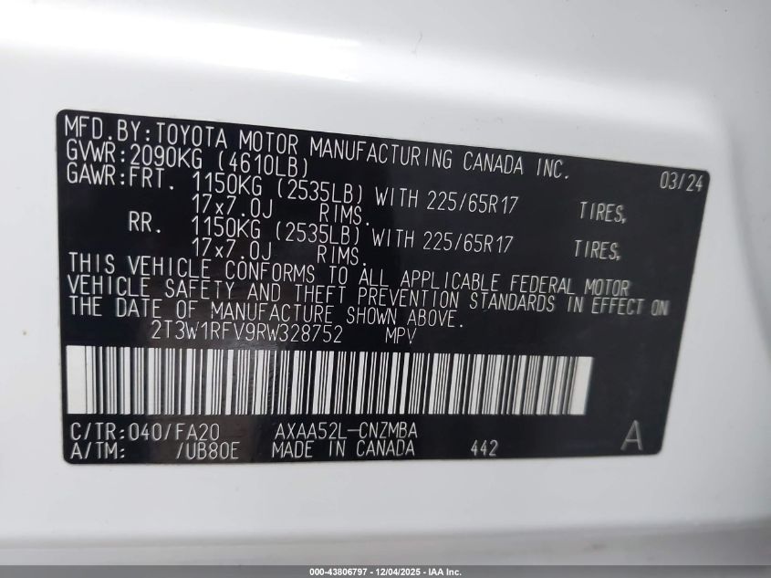 2024 TOYOTA RAV4 2024 року Бензин, 2.5, Передний привод, vin - 2T3W1RFV9RW328752 из США