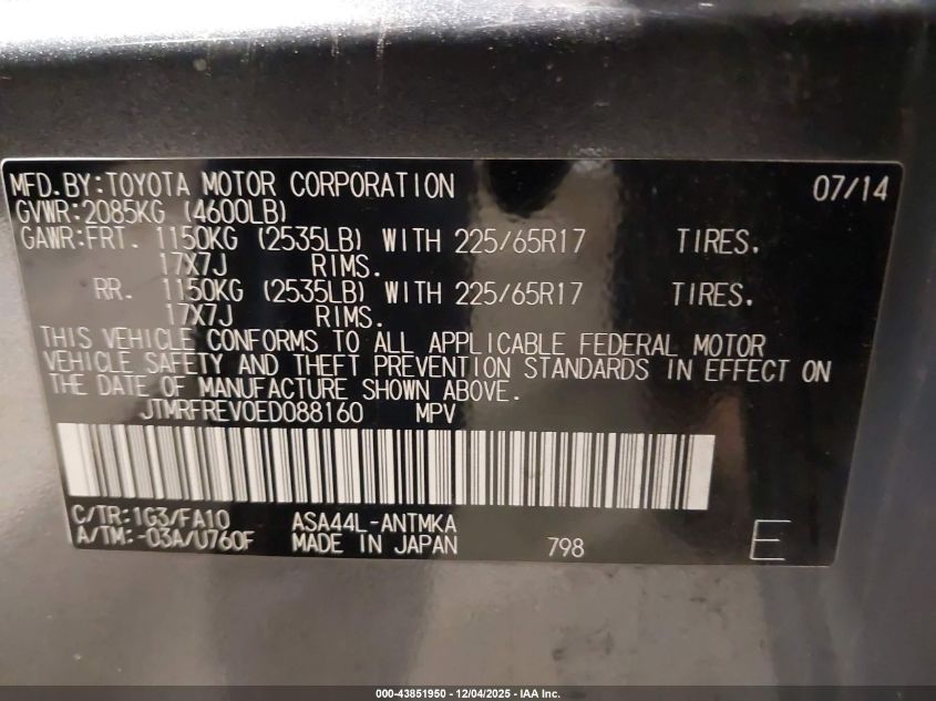 2014 TOYOTA RAV4 2014 року Бензин, 2.5, Полный привод, vin - JTMRFREV0ED088160 из США