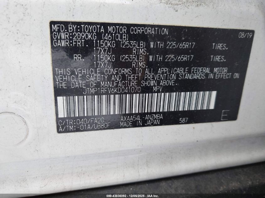 2019 TOYOTA RAV4 2019 року Бензин, 2.5, Полный привод, vin - JTMP1RFV6KD041070 из США