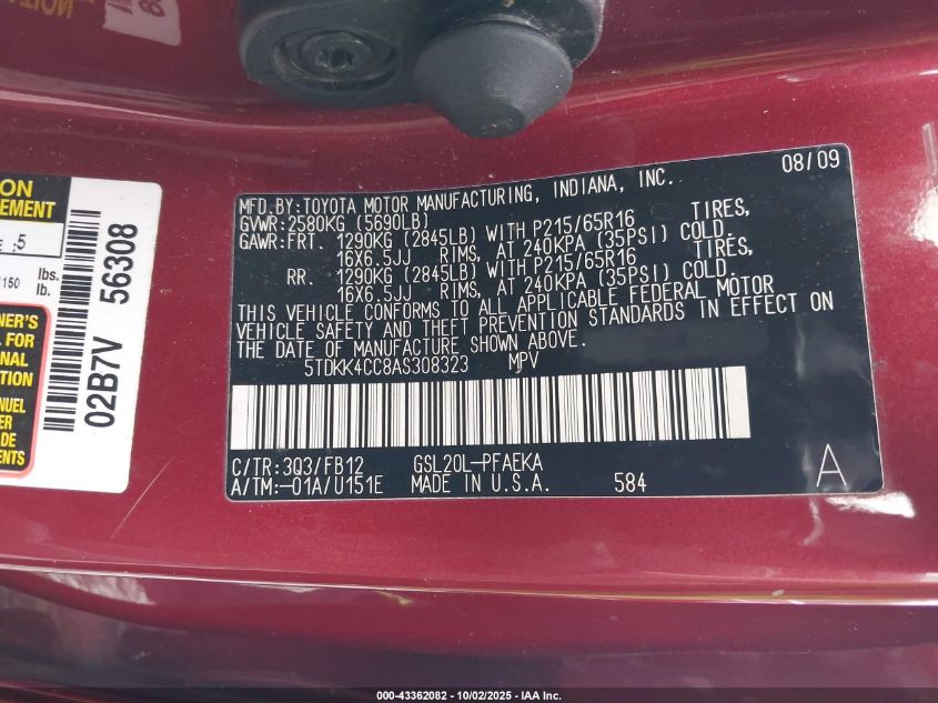 2010 TOYOTA SIENNA 2010 року Бензин, 3.5, Передний привод, vin - 5TDKK4CC8AS308323 из США