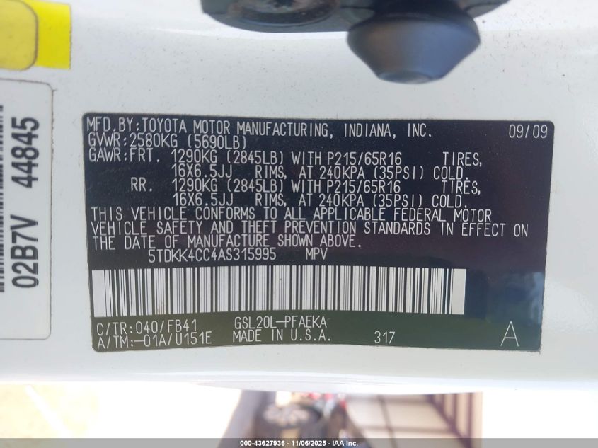 2010 TOYOTA SIENNA 2010 року Бензин, 3.5, Передний привод, vin - 5TDKK4CC4AS315995 из США