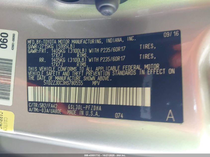 2017 TOYOTA SIENNA 2017 року Бензин, 3.5, Передний привод, vin - 5TDZZ3DC3HS780555 из США