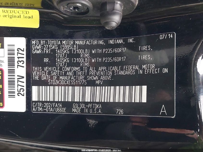 2014 TOYOTA SIENNA 2014 року Бензин, 3.5, Передний привод, vin - 5TDZK3DCXES511775 из США