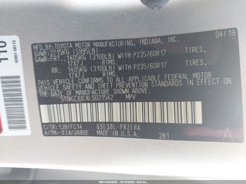 2020 TOYOTA SIENNA 2020 року Бензин, 3.5, Передний привод, vin - 5TDKZ3DCXLS021542 из США