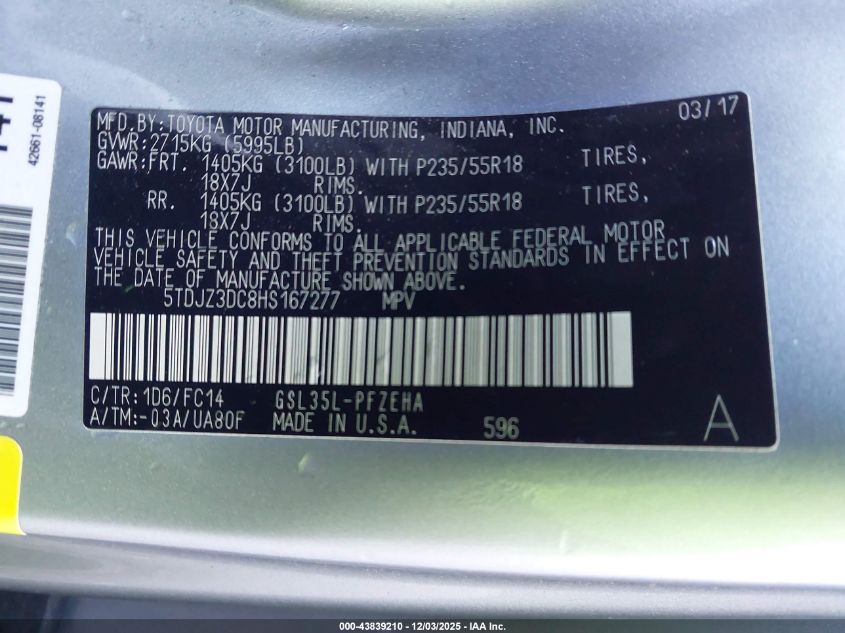 2017 TOYOTA SIENNA 2017 року Бензин, 3.5, Полный привод, vin - 5TDJZ3DC8HS167277 из США