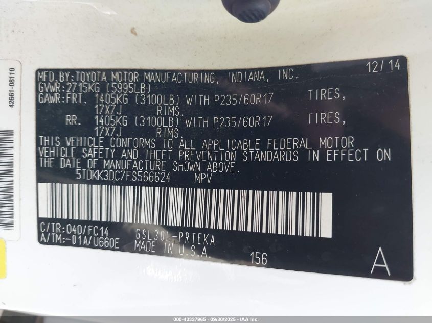 2015 TOYOTA SIENNA 2015 року Бензин, 3.5, Передний привод, vin - 5TDKK3DC7FS566624 из США