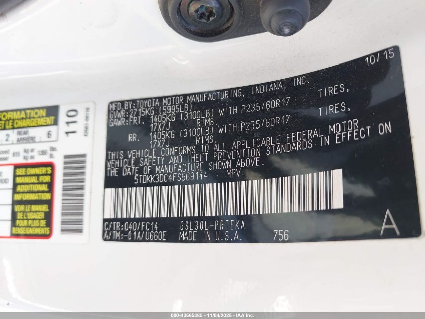 2015 TOYOTA SIENNA 2015 року Бензин, 3.5, Передний привод, vin - 5TDKK3DC4FS669144 из США