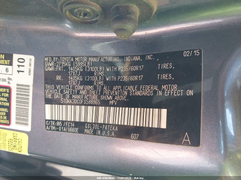 2015 TOYOTA SIENNA 2015 року Бензин, 3.5, Передний привод, vin - 5TDKK3DC0FS588965 из США