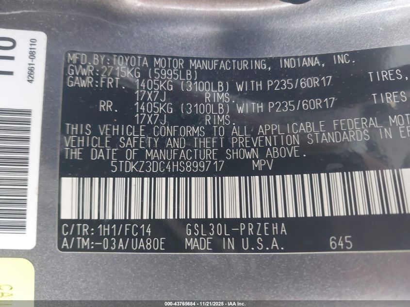 2017 TOYOTA SIENNA 2017 року Бензин, 3.5, Передний привод, vin - 5TDKZ3DC4HS899717 из США