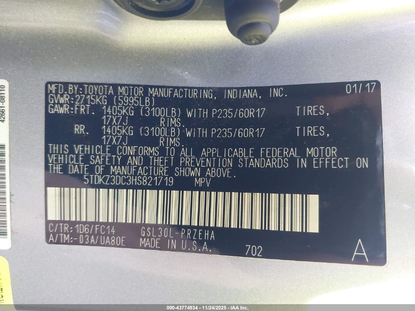2017 TOYOTA SIENNA 2017 року Бензин, 3.5, Передний привод, vin - 5TDKZ3DC3HS821719 из США