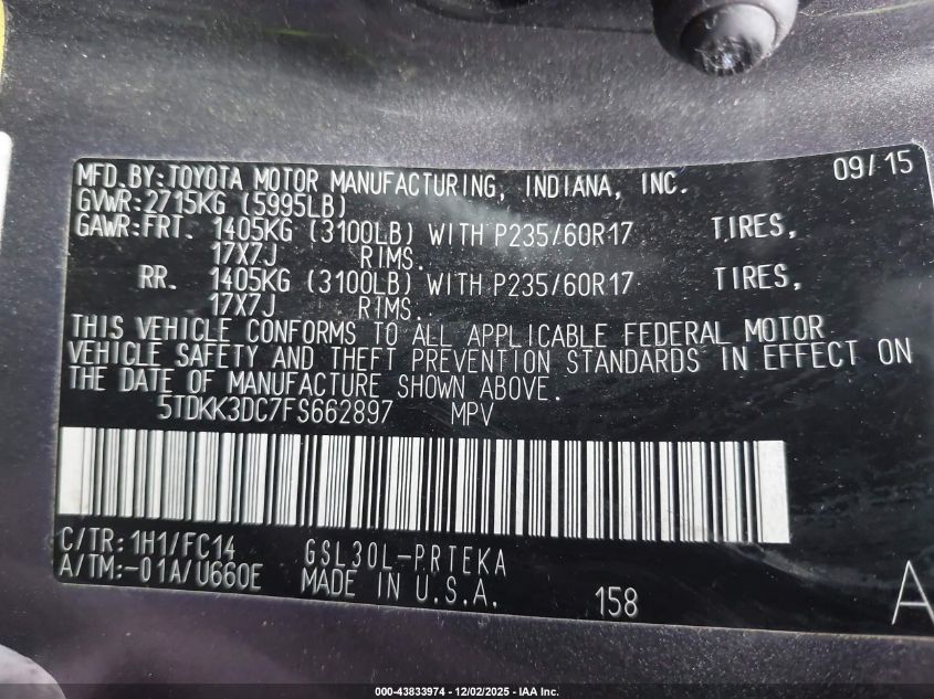 2015 TOYOTA SIENNA 2015 року Бензин, 3.5, Передний привод, vin - 5TDKK3DC7FS662897 из США