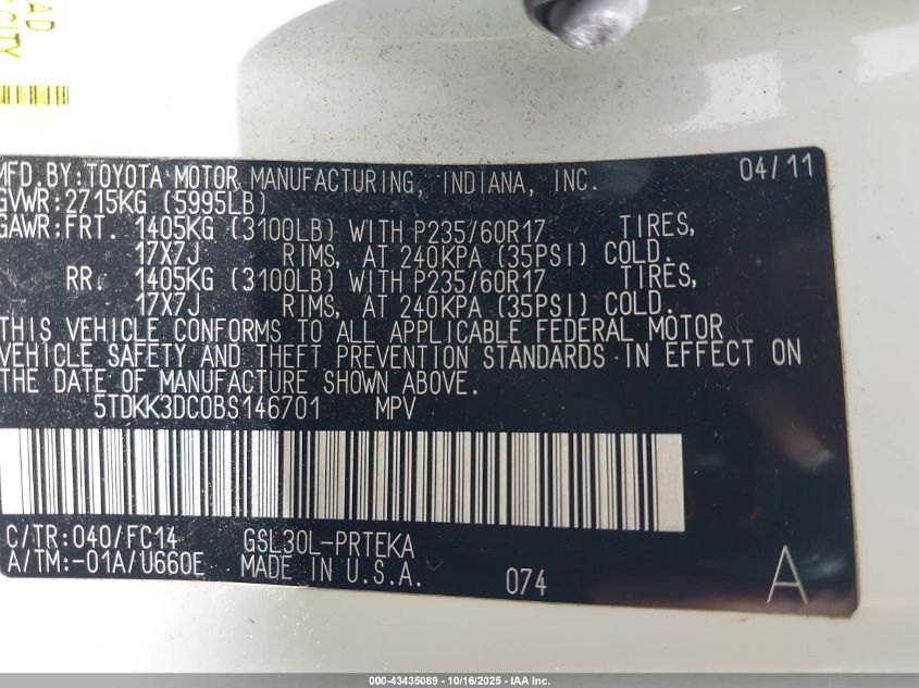 2011 TOYOTA SIENNA 2011 року Бензин, 3.5, Передний привод, vin - 5TDKK3DC0BS146701 из США