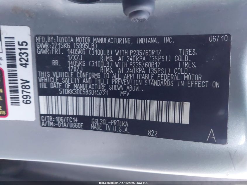 2011 TOYOTA SIENNA 2011 року Бензин, 3.5, Передний привод, vin - 5TDKK3DC5BS045721 из США