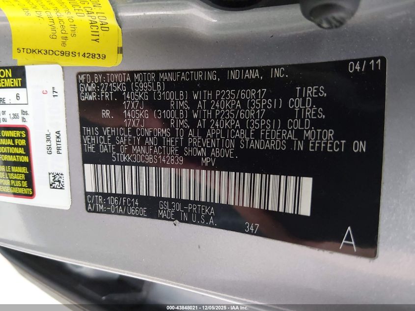 2011 TOYOTA SIENNA 2011 року Бензин, 3.5, Передний привод, vin - 5TDKK3DC9BS142839 из США