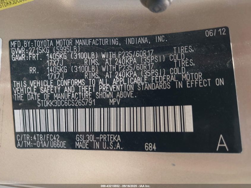 2012 TOYOTA SIENNA 2012 року Бензин, 3.5, Передний привод, vin - 5TDKK3DC6CS265791 из США