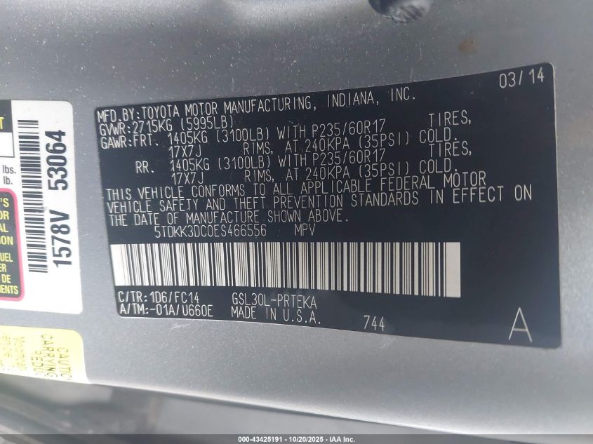 2014 TOYOTA SIENNA 2014 року Бензин, 3.5, Передний привод, vin - 5TDKK3DC0ES466556 из США