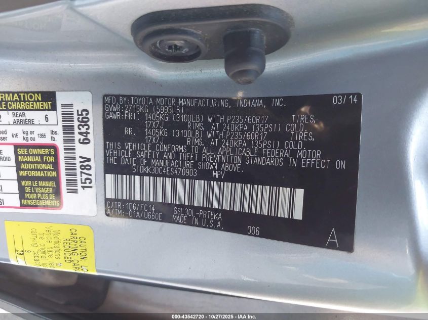 2014 TOYOTA SIENNA 2014 року Бензин, 3.5, Передний привод, vin - 5TDKK3DC4ES470903 из США