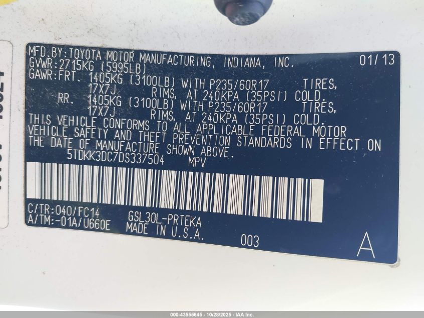 2013 TOYOTA SIENNA 2013 року Бензин, 3.5, Передний привод, vin - 5TDKK3DC7DS337504 из США