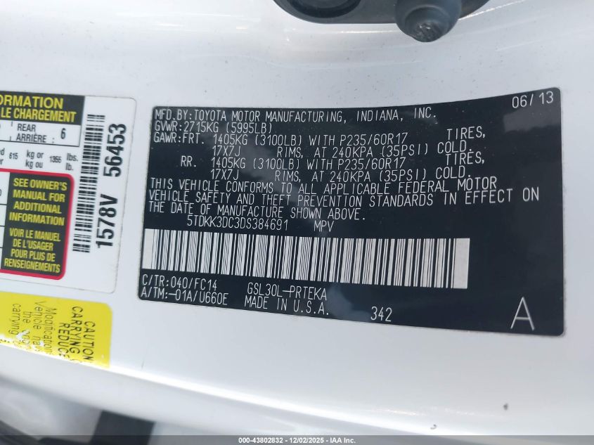 2013 TOYOTA SIENNA 2013 року Бензин, 3.5, Передний привод, vin - 5TDKK3DC3DS384691 из США
