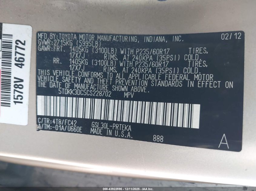 2012 TOYOTA SIENNA 2012 року Бензин, 3.5, Передний привод, vin - 5TDKK3DC5CS228702 из США