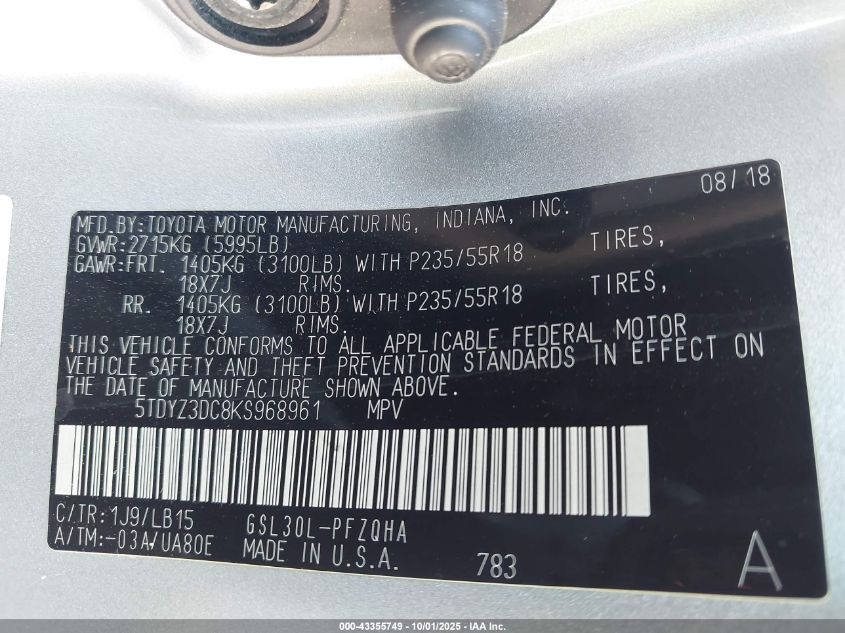 2019 TOYOTA SIENNA 2019 року Бензин, 3.5, Передний привод, vin - 5TDYZ3DC8KS968961 из США