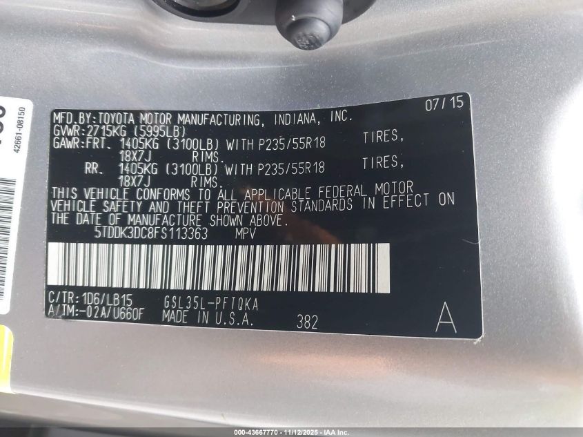 2015 TOYOTA SIENNA 2015 року Бензин, 3.5, Полный привод, vin - 5TDDK3DC8FS113363 из США
