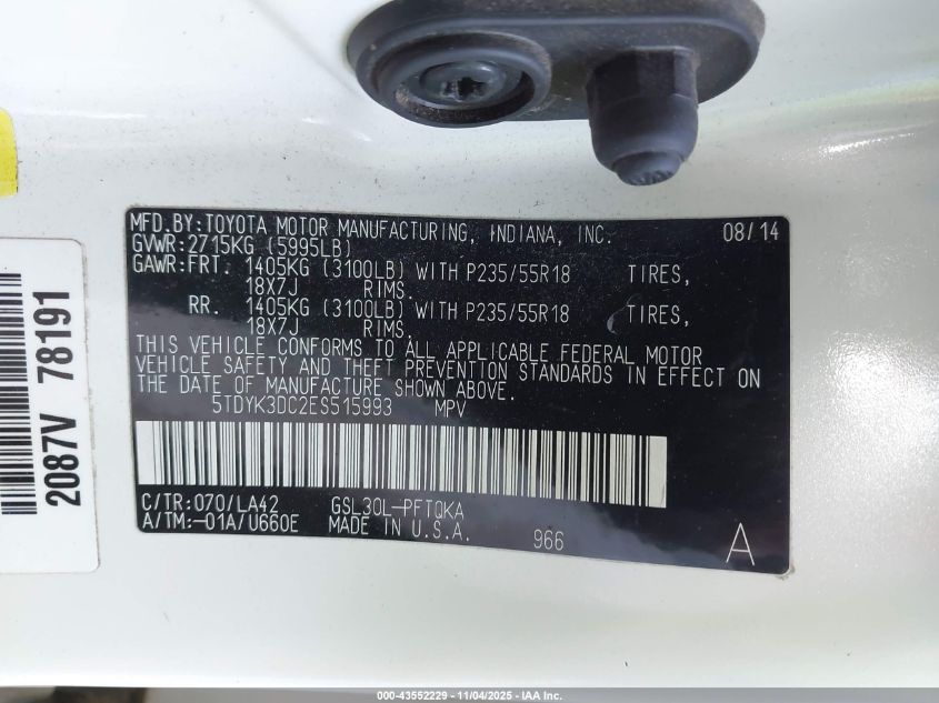 2014 TOYOTA SIENNA 2014 року Бензин, 3.5, Передний привод, vin - 5TDYK3DC2ES515993 из США