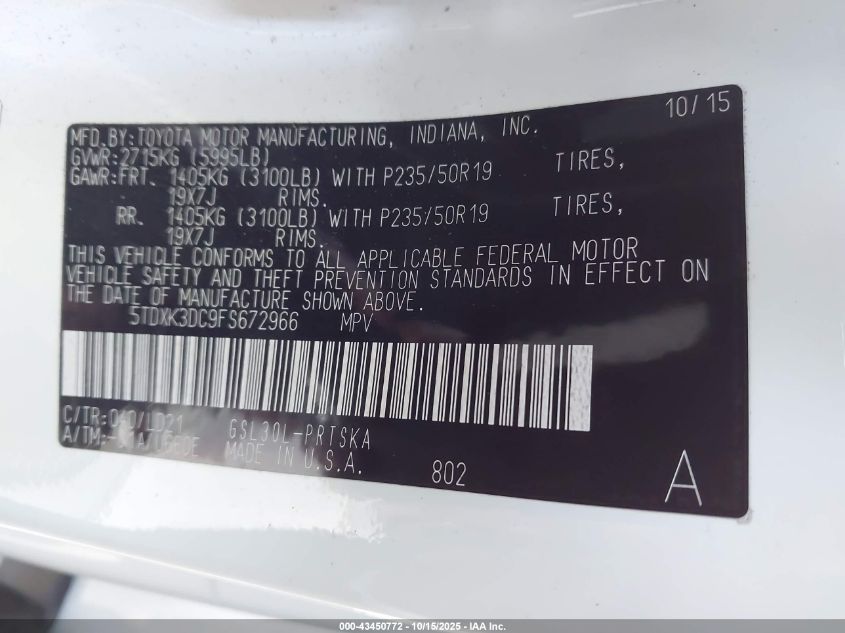 2015 TOYOTA SIENNA 2015 року Бензин, 3.5, Передний привод, vin - 5TDXK3DC9FS672966 из США