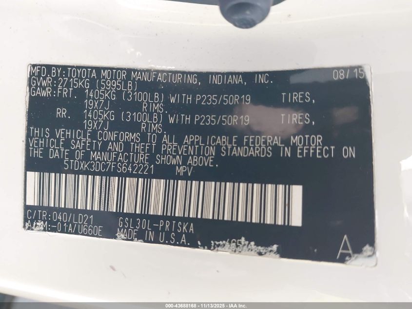 2015 TOYOTA SIENNA 2015 року Бензин, 3.5, Передний привод, vin - 5TDXK3DC7FS642221 из США