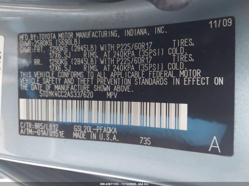Цвет СинийЦилиндры 6Привод Передний приводVIN 5TDYK4CC2AS337620Состояние Заводится и едет (проверено)Повреждения По бокам AutoRIA