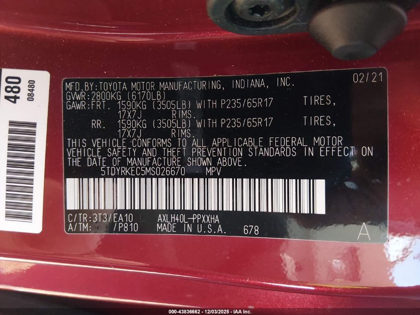 2021 TOYOTA SIENNA 2021 року Гибрид, 2.5, Передний привод, vin - 5TDYRKEC5MS026670 из США