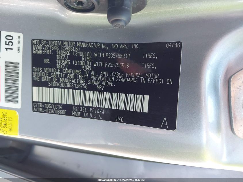 2016 TOYOTA SIENNA 2016 року Бензин, 3.5, Полный привод, vin - 5TDDK3DC8GS136756 из США