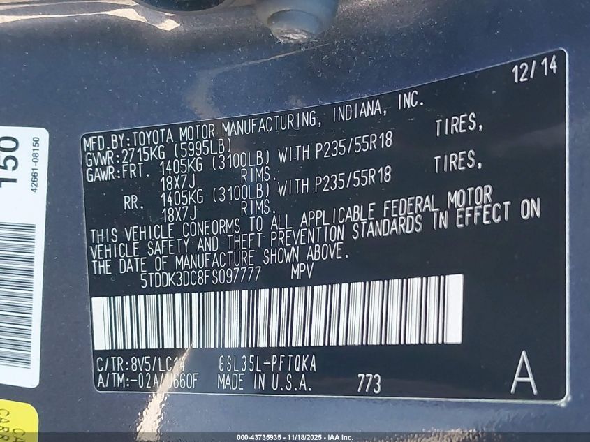 2015 TOYOTA SIENNA 2015 року Бензин, 3.5, Полный привод, vin - 5TDDK3DC8FS097777 из США