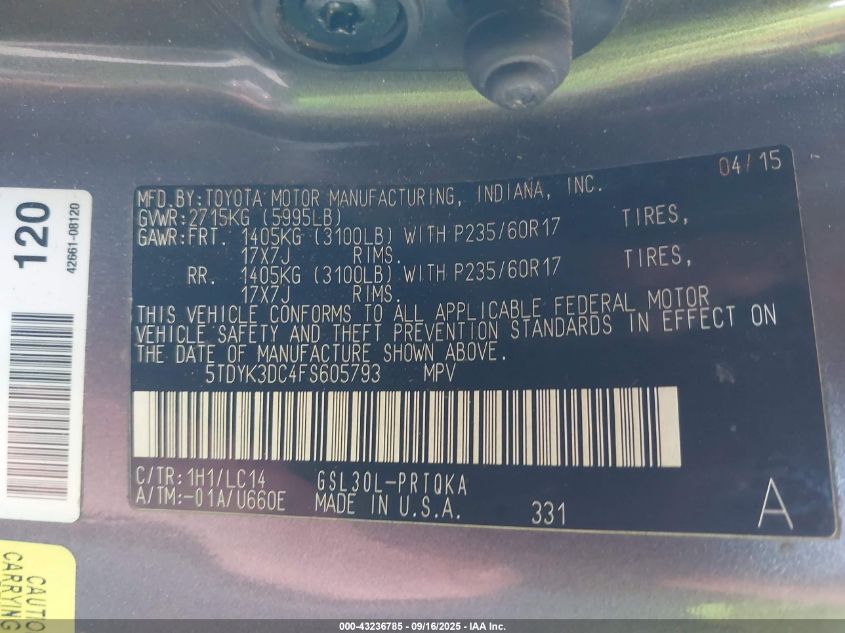 Цвет СерыйЦилиндры 6Привод Передний приводVIN 5TDYK3DC4FS605793Состояние Заводится и едет (проверено)Повреждения Левая сторонаДата аукциона 2025-12-09 AutoRIA