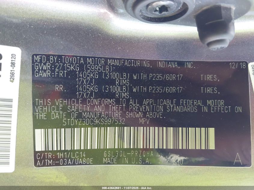 2019 TOYOTA SIENNA 2019 року Бензин, 3.5, Передний привод, vin - 5TDYZ3DC9KS997532 из США