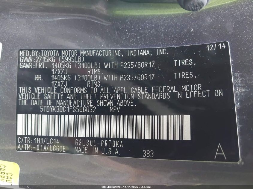 2015 TOYOTA SIENNA 2015 року Бензин, 3.5, Передний привод, vin - 5TDYK3DC1FS566032 из США