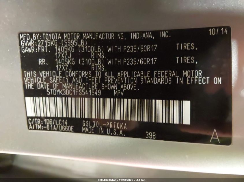 2015 TOYOTA SIENNA 2015 року Бензин, 3.5, Передний привод, vin - 5TDYK3DC1FS541549 из США