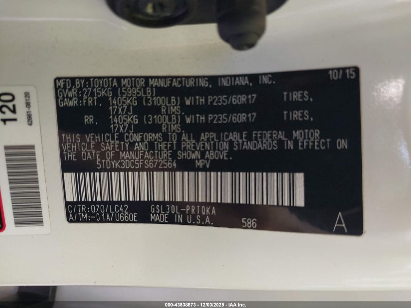 2015 TOYOTA SIENNA 2015 року Бензин, 3.5, Передний привод, vin - 5TDYK3DC5FS672564 из США