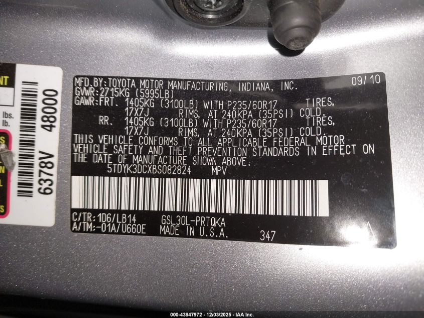 2011 TOYOTA SIENNA 2011 року Бензин, 3.5, Передний привод, vin - 5TDYK3DCXBS082824 из США