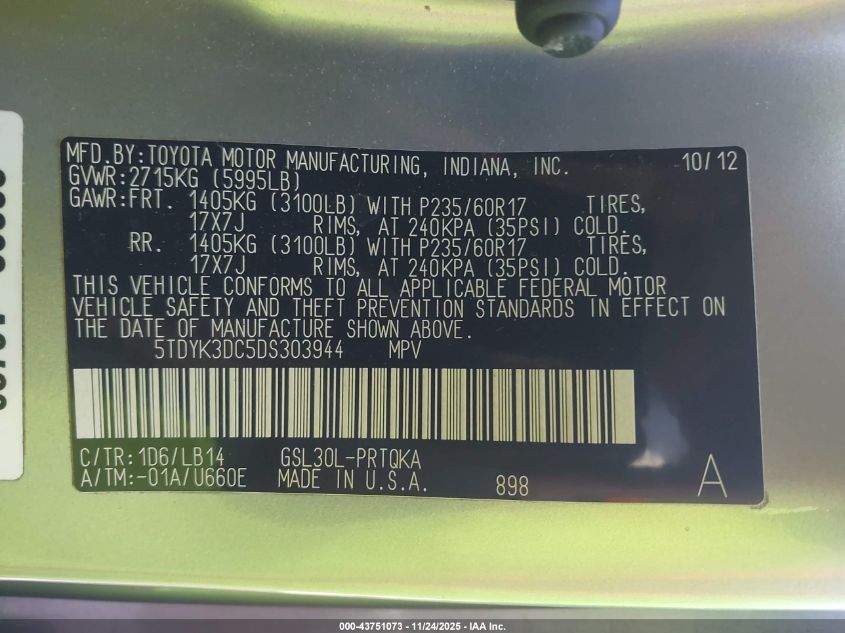 2013 TOYOTA SIENNA 2013 року Бензин, 3.5, Передний привод, vin - 5TDYK3DC5DS303944 из США