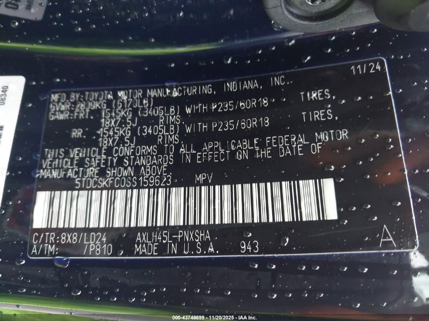 Цвет СинийЦилиндры 4Привод Полный приводVIN 5TDCSKFC0SS159623Состояние СтационарноПовреждения Левая сторонаДата аукциона 2025-12-15