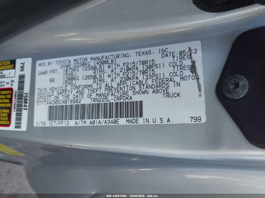 2012 TOYOTA TACOMA 2012 року Бензин, 2.7, , vin - 5TFTX4CN5CX018982 из США