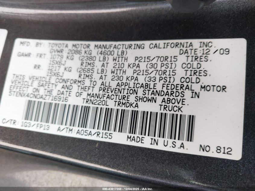 2010 TOYOTA TACOMA 2010 року Бензин, 2.7, , vin - 5TENX4CN0AZ716916 из США