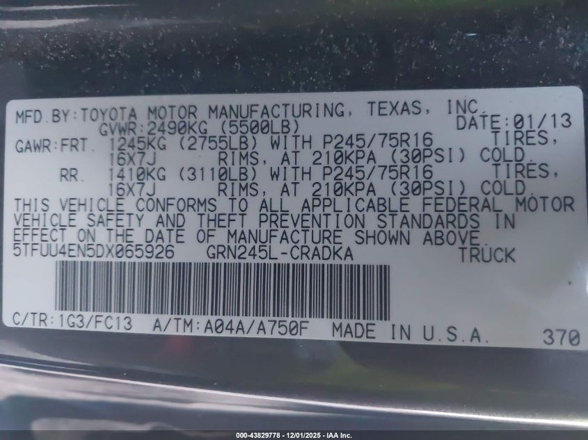 2013 TOYOTA TACOMA 2013 року Бензин, 4.0, Полный привод, vin - 5TFUU4EN5DX065926 из США