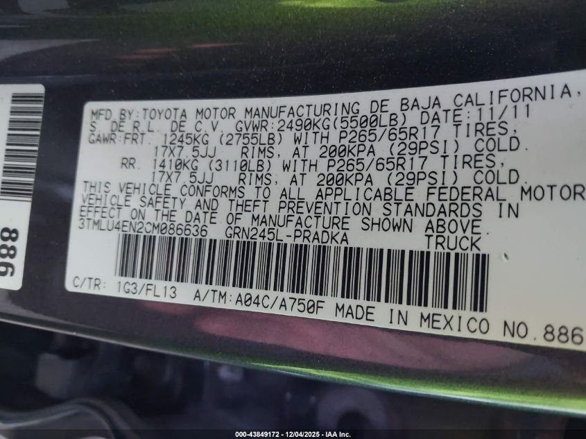 2012 TOYOTA TACOMA 2012 року Бензин, 4.0, Полный привод, vin - 3TMLU4EN2CM086636 из США